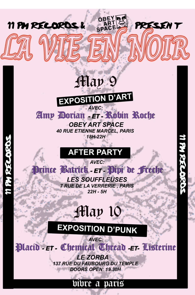 Last Friday, 11PM Records, the North American hardcore label presented 'La Vie En Noir' a group show at OBEY ART SPACE Paris with Amy Dorian and Rob Roche, followed by a punk show the next night.