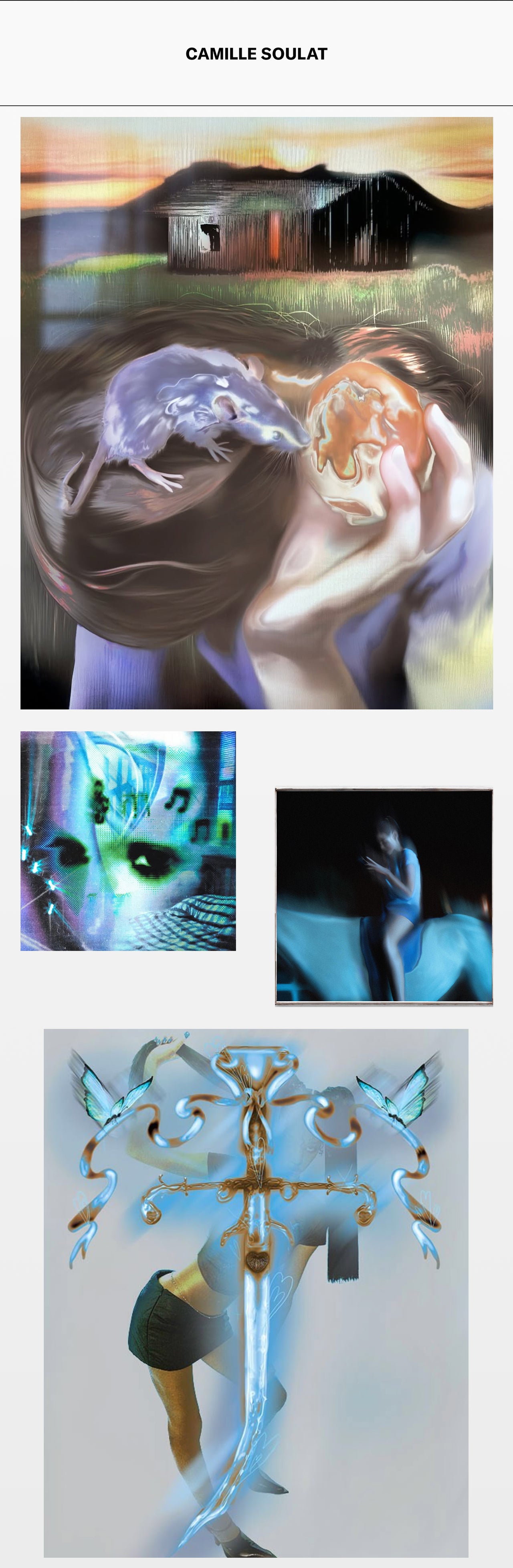 Camille Soulat (b 1991) grew up in Montluçon, France. She is self-taught and uses mediums ranging from digital painting and writing, to video installation. Her practice revolves around an intimate form of narration. She concentrates on nostalgic subjects and scenes with super-natural undertones. Through the diffuse shapes and silhouettes of her digital paintings, Camille exhibits a certain fascination for the transformation of ordinary moments into events. Interested in notions such as marginality, geek culture or adolescence, she directs her practice around an interpretation and a celebration of the codes associated with both pop culture and counterculture.