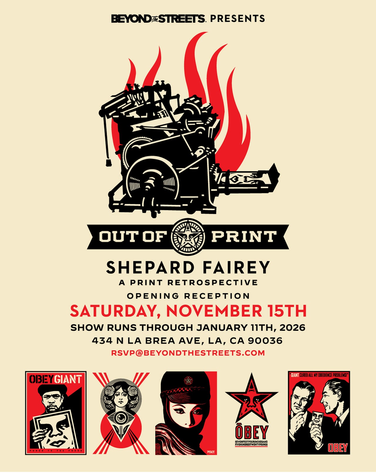 SHEPARD FAIREY: OUT OF PRINT will be on view Wednesday–Sunday, 11 AM–6 PM through January 11, 2026 | Free Entry